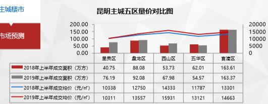 商品住宅分區:官渡區項目最多,從成交量價看2019年上半年大多區域均有不同幅度的上漲。