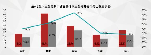 2019年上半年昆明主城商品推盤中,官渡區開盤量、成交量位居五區第一,盤龍區位居第二,盤龍區因區位優勢,且核心板塊如盤龍區中心板塊、北市板塊、世博板塊、盤龍區東市板塊等均多盤在售,且多項目開盤認購率最高,盤龍區開盤去化率達79%。未來隨著官渡區多個板塊項目入市,以及呈貢多個項目入市,供需及認購率均會再上一層樓。