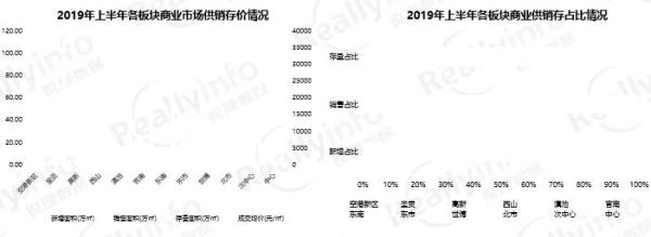 【各區域供銷存價分析】2019年上半年商業新增東市區占據榜首,占比43%;銷量、存量均為南市區占據榜首,分別占比 38%、33%;東市區銷量占比最小;售價最高為中市區26911元/㎡。