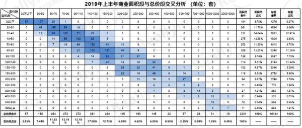 【面積段 X 總價段】上半年商業核心成交面積段主力為20-80㎡,占比64%,總價段為50-200萬,占比66%。