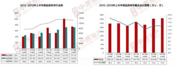 2019年上半年商品房市場整體剛需平衡,供應737.4萬㎡,同比上漲40.24%,成交722.5萬㎡,同比上漲12.57%,成交 均價11207元/㎡,同比降低3.64%;商品房庫存約1632萬㎡,去化周期約14.3個月,庫存與去化周期與去年持平