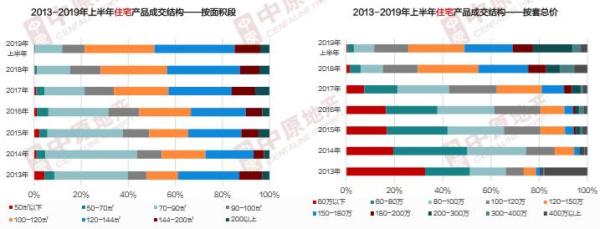 2019年上半年主力住宅成交面積100-144㎡,改善類產品占比逐年增加,總價段以120-180萬元產品為主
