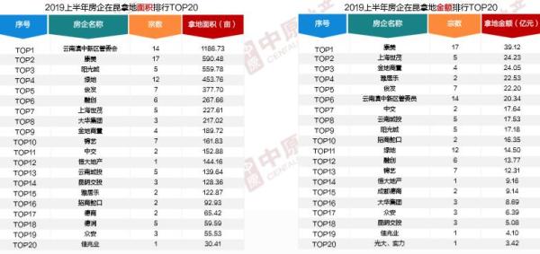 2019上半年房企在昆明招拍掛拿地TOP20榜中,滇中管委會及康美分別位列拿地面積、金額榜榜首,6家新進房企進入TOP榜,分別為世茂、錦藝、雅居樂、德商、眾安、光大,昆明成為房企囤地重點城市