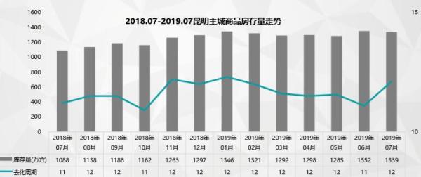 7月,昆明市場可售面積1339萬方,同比增加253萬方,環比下降13萬方,整體而言去化壓力不大;7月,市場維穩,供求保持一定的平衡,消化周期處在12個月正常范圍內。