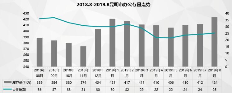 2019年8月辦公市場庫存過盛,庫存量持續上漲,依舊保持高位,去化周期有所延長。