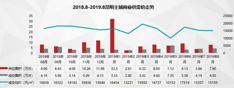 8月商業供應面積7.9萬方,環比上漲104.79%,同比上漲7.34%,供應有所回落;8月商業成交面積4.5萬方,環比下降2.02%,同比上升7.33%,成交疲軟;8月商業成交均價15159元/平米,環比下降1.29%,同比下降8.89%,整體成交均價下降。