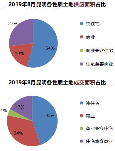 8月昆明住宅兼容商業用地成交3宗,面積169.51畝,占比17%。