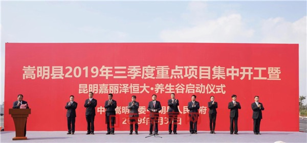 9月30日,嵩明縣2019年三季度重點項目集中開工暨昆明嘉麗澤恒大·養生谷奠基儀式在昆明嘉麗澤恒大·養生谷項目現場舉行,云南滇中新區黨工委委員,楊林經開區黨工委書記、管委會主任,中共嵩明縣委書記楊相來,中共嵩明縣委副書記、代理縣長李進波,恒大健康集團西部公司董事長戴軍等人出席儀式。