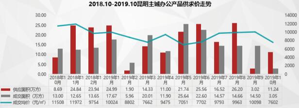 辦公市場前期存量過盛,市場以去庫存為核心,辦公市場供應量大幅上漲,成交呈下降趨勢,均價下降。