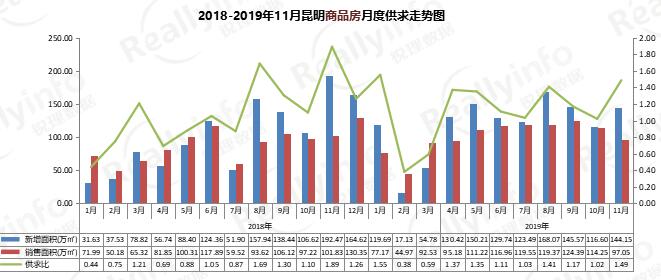 本月商品房新增面積144.15萬方,環比上漲23.63%,同比下降25.11%;銷售面積97.05萬方,環比下降15.05%,同比下降4.70%;供求比為1.49。