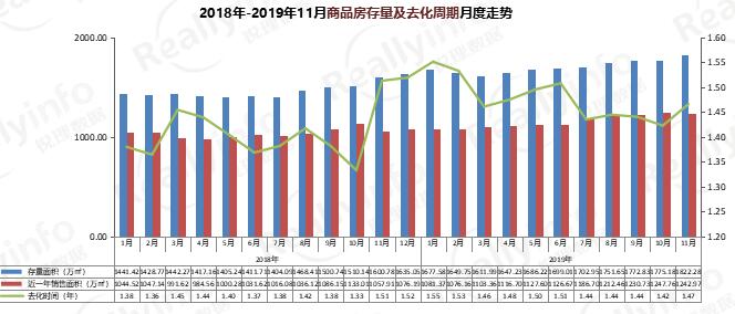截止2019年11月30日,商品房庫存1822.28萬方,按近一年銷售面積1242.97萬方計算,還需1.47年去化,去化周期較上月略有上升。