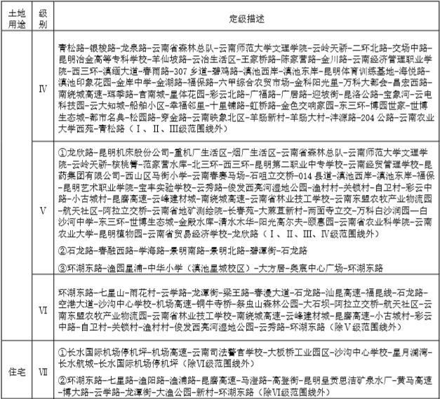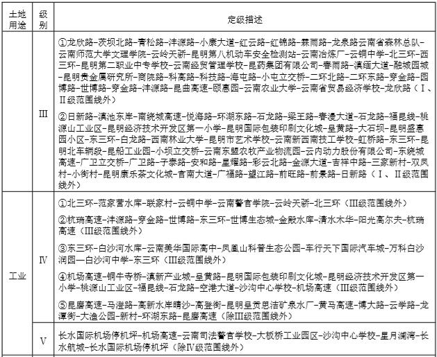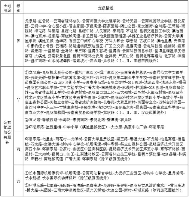 昆明主城規(guī)劃區(qū)(呈貢區(qū)、五華區(qū)、盤龍區(qū)、官渡區(qū)、西山區(qū))、三個開發(fā)區(qū)(滇池旅游度假區(qū)、高新技術(shù)產(chǎn)業(yè)開發(fā)區(qū)、經(jīng)濟技術(shù)開發(fā)區(qū))及空港經(jīng)濟區(qū)范圍內(nèi)的商服用地劃分為7個級別,住宅用地劃分為7個級別,工業(yè)用地劃分為5個級別;公共管理與公共服務(wù)用地劃分為7個級別。見表1、表2。