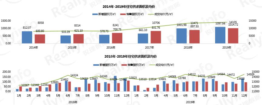 2019年全年昆明房地產(chǎn)住宅市場逐漸穩(wěn)定,供求價穩(wěn)定上漲,供應(yīng)量1097.56萬㎡,成交量1014.72萬㎡,市場均價14105元/㎡,供求比約1.2市場供求關(guān)系平衡;同比2018年新增供應(yīng)上漲近10%,銷售面積漲幅13%,成交均價上漲5%,2019年相較2018年相比漲幅有所下降,呈現(xiàn)穩(wěn)定增長的態(tài)勢,昆明房地產(chǎn)市場依舊龐大。