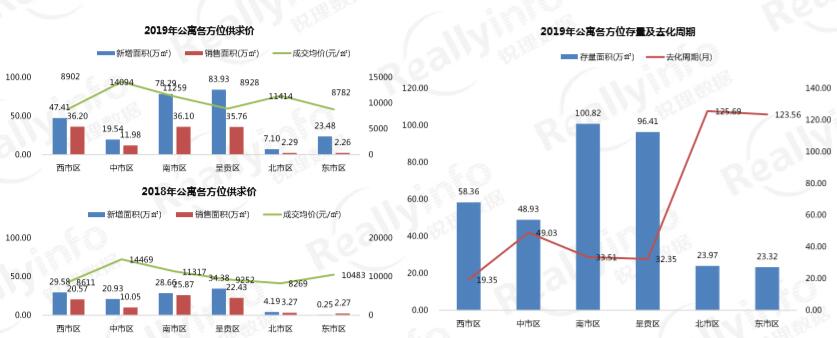 西市區、南市區不呈貢區市場公寓供銷體量相比其他片區較大,是目前主力區域;對比18、19年數據除北市區,各片區新增均有所上漲,其中東市區公寓新增上漲最快,成交情況最好的片區為西市區,較去年上漲79%;在各個片區中南市區存量101萬方為各區域最高,北市區去化126個月為各區域最高。