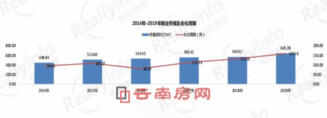 數據顯示,截至2019年底,昆明商業存量達645.38萬平方米,較2018年的569.42萬平方米增加了75.96萬平方米,增幅為13.34%;與此同時,去化周期也從2018年的132.45個月延長為160.16個月,不管是存量還是去化周期,都創下了2014年以來的歷史新高。