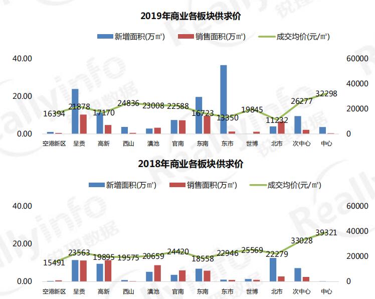 2018年和2019年商業各板塊供求價(源于昆明銳理數據)