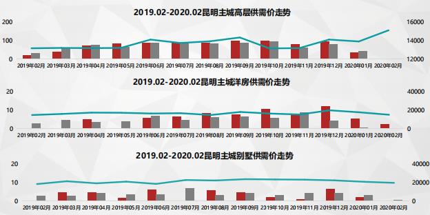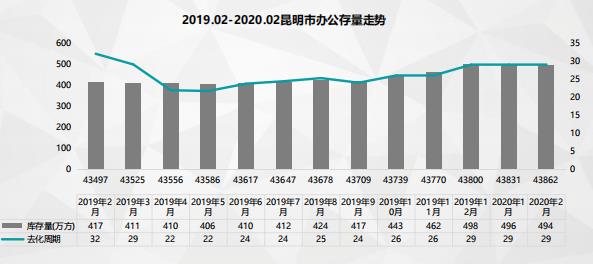2月昆明市場(chǎng)可售面積1641萬(wàn)方,同比降低7萬(wàn)方,環(huán)比上漲320萬(wàn)方,去化壓力大,2月市場(chǎng)走勢(shì)保持平穩(wěn),消化周期處在14個(gè)月左右。