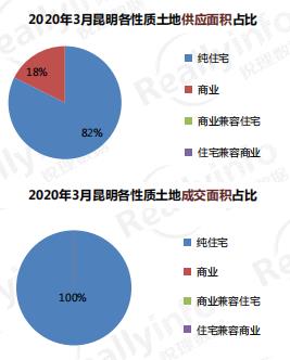 3月昆明純住宅用地供應7宗,面積555.15畝,占比82%;3月昆明商業用地供應4宗,面積118.64畝,占比18%;3月昆明商業兼容住宅用地無供應;3月昆明住宅兼容商業用地無供應。