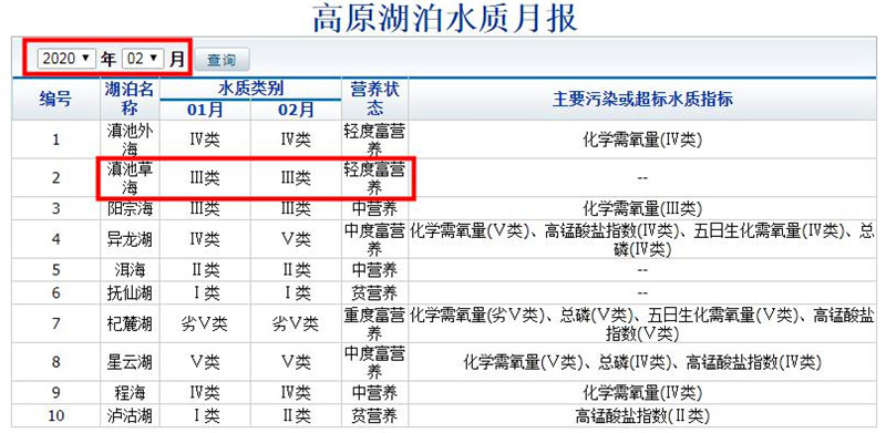 《高原湖泊水質月報》顯示草海水質顯著改善(來源:云南省生態環境廳)