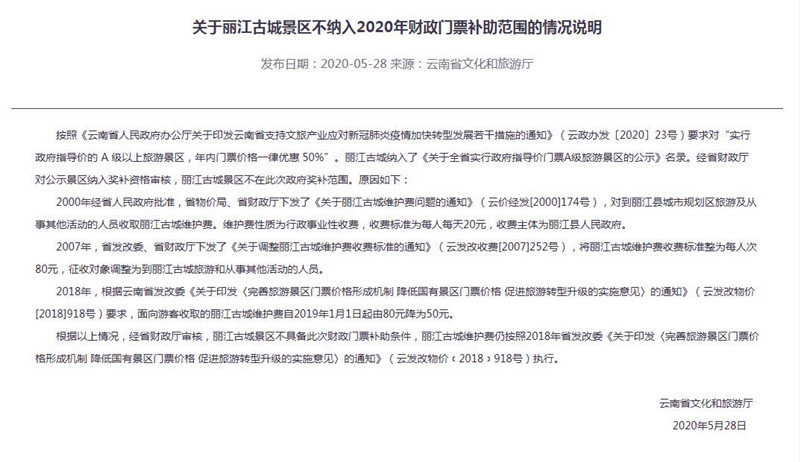5月28日,云南省文化和旅游廳公布《關(guān)于麗江古城景區(qū)不納入2020年財(cái)政門票補(bǔ)助范圍的情況說明》,明確麗江古城不在實(shí)行政府指導(dǎo)價(jià)的云南省A級(jí)旅游景區(qū)之列,麗江古城的50元維護(hù)費(fèi)不變。