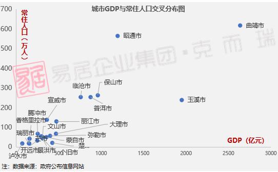 從大云南各地州城市GDP及常住人口交叉圖看,滇中城市群整體表現較好,而曲靖城市面表現最為搶眼,人口基數大,城市經濟發展優異,排名位列第一。玉溪以現代服務業、生物醫藥與大健康產業、煙草等產業帶動城市經濟,城市基本面表現良好,與曲靖同排第一梯隊。
