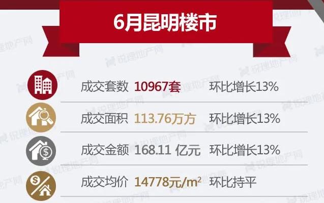 數據顯示,2020年6月昆明商品房(包括昆明主城的新建住宅、商業和辦公物業,住宅不含團購房)成交了10967套,成交面積為113.76萬平米,成交金額為168.11億元,3項數據的漲幅均為13%;成交均價為14778元/平米,環比持平,形勢繼續向好。