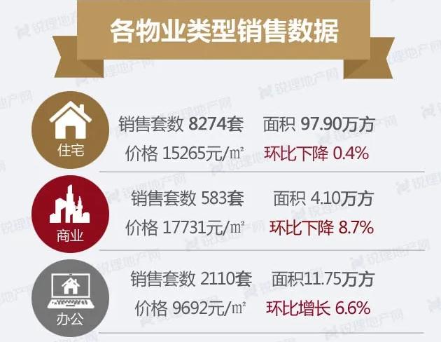 不同物業類型來看,住宅成交套數為8274套,面積為97.90萬平米,價格為15265元/平米,環比小跌0.4%;商業成交套數為583套,面積4.10萬平米,價格為17731元/平米,環比下降8.7%;辦公成交套數2110套,面積11.75萬平米,價格9692元/平米,環比增長6.6%。
