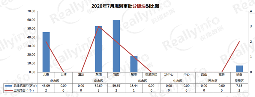 本月除中市區(qū)和西市區(qū)外其他區(qū)均有項(xiàng)目過規(guī),其中南市區(qū)過規(guī)體量最大,過規(guī)建面112.24萬方,占比61%;北市區(qū)過規(guī)建面46.09萬方,占比25%;東市區(qū)過規(guī)建面18.44萬方,占比10%;呈貢區(qū)過規(guī)建面7.65萬方,占比4% 。