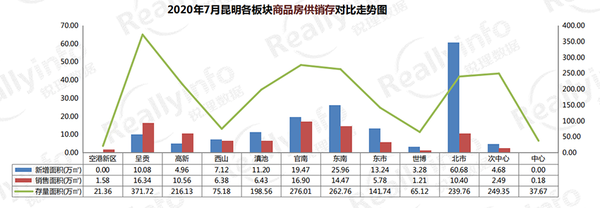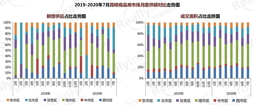 本月所有區(qū)域均有新增供應(yīng),其中北市區(qū)供應(yīng)78.29萬方,占比40%;呈貢區(qū)供應(yīng)13.88萬方,占比7%;南市區(qū)供應(yīng)62.79萬方,占比32%; 西市區(qū)供應(yīng)15.79萬方,占比8%;東市區(qū)供應(yīng)21.76萬方,占比11%;中市區(qū)供應(yīng)5.47萬方,占比3%。
