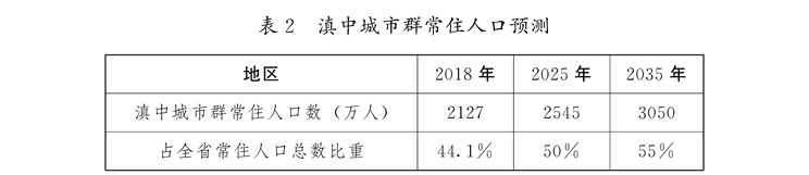 到2025年,滇中城市群功能基本完善,綠色生態格局穩步提升,現代產業體系特色鮮明,對內對外開放格局基本形成,城鄉空間格局大幅優化,邊疆更加繁榮穩定。人口和經濟密度進一步提高,聚集全省50%的人口和68%的地區生產總值。