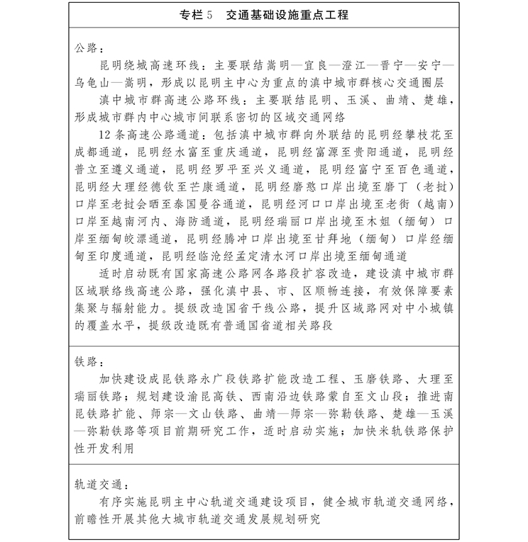 構建快速通達的鐵路交通網絡。堅持省際貫通、省內成網、沿邊通暢、周邊互通,完善滇中城市群鐵路交通體系。重點推進昆磨、昆瑞、昆河通道鐵路建設及提升改造,強化與周邊國家互聯互通。加快渝昆高鐵、彌蒙鐵路等項目實施。根據運輸需要,實施低標準既有鐵路擴能改造,提升既有鐵路城際客運功能和運輸能力,加強路地合作,加快米軌鐵路保護性開發利用。加快實施既有成昆鐵路永廣段等鐵路擴能改造,積極推進西南沿邊鐵路蒙自—文山段鐵路前期工作。利用既有鐵路富余能力開行城際列車,提高滇中城市群城市間通達性。