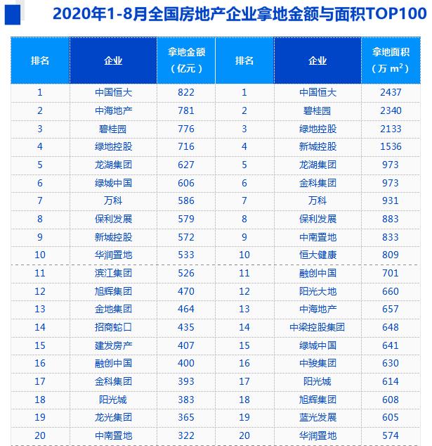 2020年1-8月,TOP100企業拿地總額21162億元,拿地規模同比增長7.2%。TOP100門檻值升至54億元,環比增長10.2%,TOP100企業招拍掛權益拿地總額占全國300城土地出讓金的比例為55.2%。