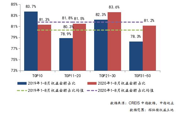 圖:2020年1-8月50家代表房企各陣營招拍掛權益金額占比