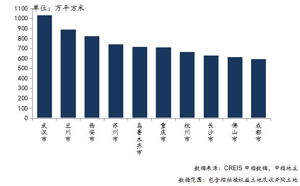 中西部省會城市與城市群內熱點城市頗受青睞。1-8月,50家代表房企拿地TOP10城市中,中西部省會城市占7席,其中武漢、蘭州和西安分列前三位,重慶、長沙及成都也較受歡迎;長三角城市群有兩個城市上榜,蘇州、杭州分別位居第四、七位;粵港澳大灣區城市群中的佛山熱度持續,拿地面積位居第九位。