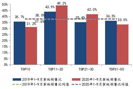 圖:2020年1-9月50家代表房企各陣營拿地銷售比