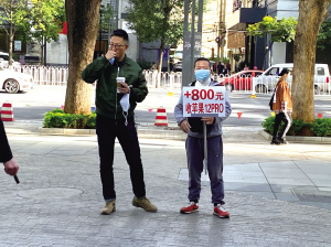 一位男士在順城蘋果旗艦店門口舉牌,希望收購iPhone 12 Pro