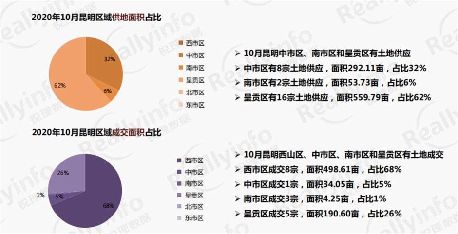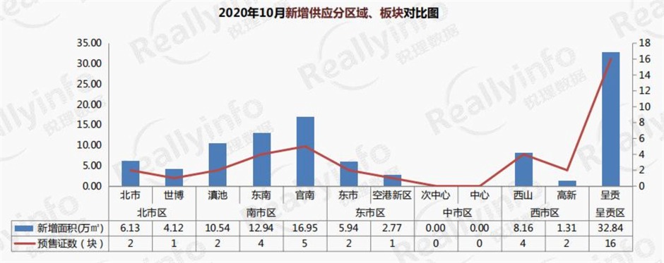 新增:新增面積前三為呈貢、東南和官南板塊,分別為20.03、12.94和12.39萬方;