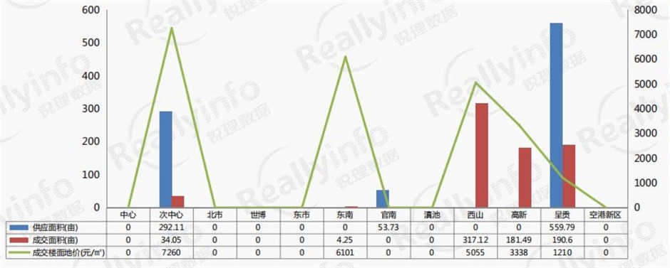 本月土地供應中,呈貢板塊供應量最多,為559.79畝;西山板塊成交量最多,為317.12畝,次中心板塊樓面地價最高,為 7260元/㎡。