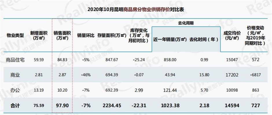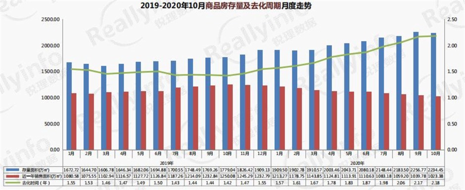 截止2020年10月31日,商品房庫存2234.45萬方,按近一年銷售面積1023.38萬方計算,還需2.18年去化,去化周期較 上月略有延長。