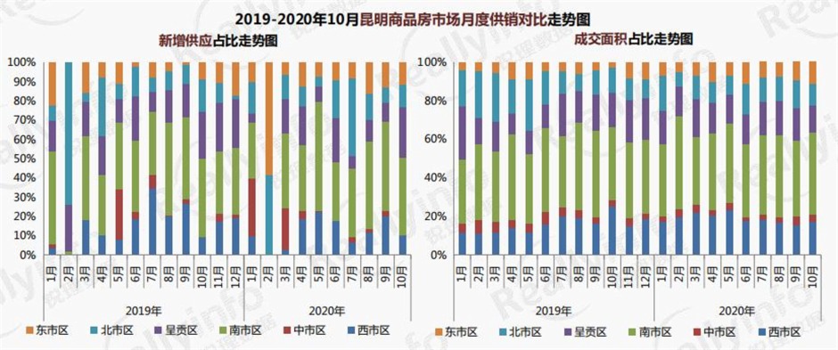 本月除中市區外其他區域均有新增供應,其中北市區供應10.25萬方,占比10%;呈貢區供應32.84萬方,占比32%;南 市區供應40.43萬方,占比40%;西市區供應9.47萬方,占比9%;東市區供應8.71萬方,占比9%。