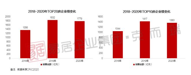 TOP20、 TOP10房企整體業績均較2019年有所下滑,跌幅分別為2.89%、3.77%。二者差距主要來自新上榜房企集中于11-20名區間,客觀經濟環境對TOP10業績規模直接抑制作用突出。