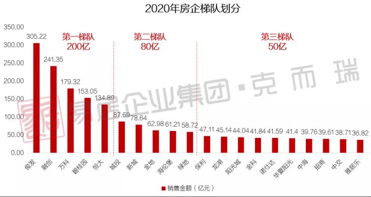 2020年第一梯隊企業、排名與2019年一致。俊發銷售額超300億元、融創銷售額超200億元,二者差距縮小,其余處100-200萬區間。