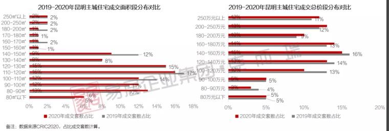 2020年,昆明主城住宅成交以120-180萬元總價為主力,占比42%,其中140-160萬總價占比15%。與2019年相比,160萬元以上總價段占比均提升1個百分點。