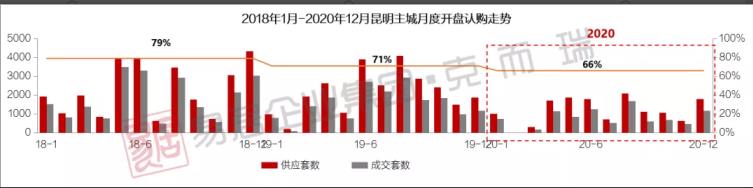 2020年受到市場客觀經濟環境因素,整體推盤量較去、前年有明顯下降。集中推盤在疫情明顯好轉后二季度、黃金銷售期9月份、年末12月份,市場客戶觀望情緒加重,多蓄客不足,去化效果一般。年均認購率亦下滑至近三年最低點,較上年下跌5個百分點。