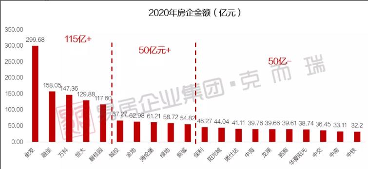相較于去年房企業績來看,融創業績增長較快,主要得益于其多元合作模式以及貨儲充足,恒大憑借郊縣文旅大盤助力業績增長排名上升,萬科深耕昆明, 中高端改善為主,且熱點板塊布局剛需剛改產品,但貨儲減少,2020年業績有所下滑。俊發以300億銷售業績高居榜首,較去年業績小幅上升,融創排名上升至第二位。