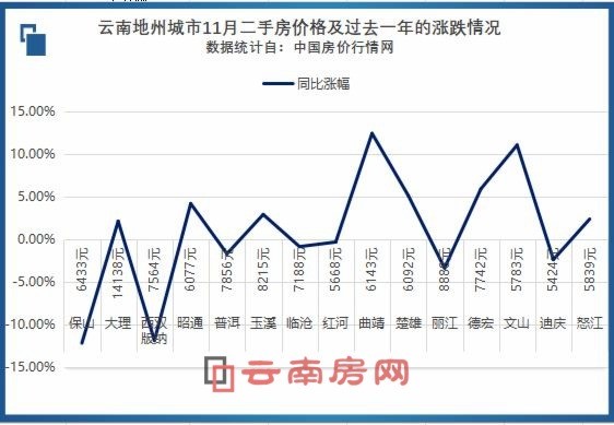 其中,漲幅最大的是曲靖,今年11月的二手房?jī)r(jià)格為6143元/平米,相比去年同期上漲了12.47%;其次是文山,今年11月二手房均價(jià)為5783元,過(guò)去一年的房?jī)r(jià)累積漲幅達(dá)到了11.1%;