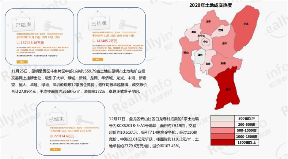 【土拍市場】昆明主城供應土地208宗,成交178宗,共約82家企業參拍,其中知名房企30余家,多地塊溢價成交;拿 地企業和溢價率持續走高,房企拿地競爭激烈。