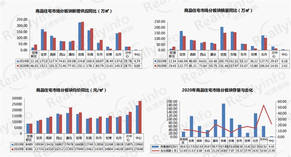 【住宅供銷價】一季度住宅市場受疫情影響,供銷價下降明顯,二季度市場逐漸回暖,供求價穩定上漲,截止2020年末供應量1131.08萬㎡,成交量866.67萬㎡,市場均價15036元/㎡;同比2019年新增供應上漲3%,銷售面積下跌15%, 成交均價上漲6.6%。