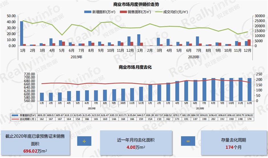 【商業存量與去化】2020年商業市場整體供大于求,均價持續下降;截止年末商業新增99.44萬㎡,銷售47.99萬㎡, 均價16220元/㎡,存量696.02萬㎡,需174個月(約14.5年)才能去化。