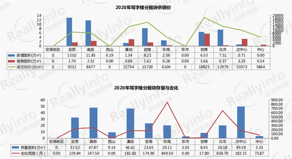 【公寓分板塊對比】2020年辦公市場官南、呈貢和東南板塊供應量最多,呈貢、高新、官南板塊成交量較高,呈貢、 東南和官南板塊存量面積最大,世博板塊去化周期最長。